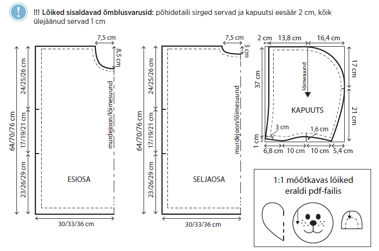 *** Lõika, kui soovid kapuutsile/taskule kõrvu.