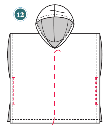 6.Aseta kapuuts kaelaavasse, paremad pooled vastamisi. Kapuutsi seljaosa ühendusõmblus on kohakuti põhidetaili seljakeskjoonega ja kapuutsi vastasmärgid põhidetaili vastasmärkidega, kapuutside eesääred kattuvad esikeskjoonel.
