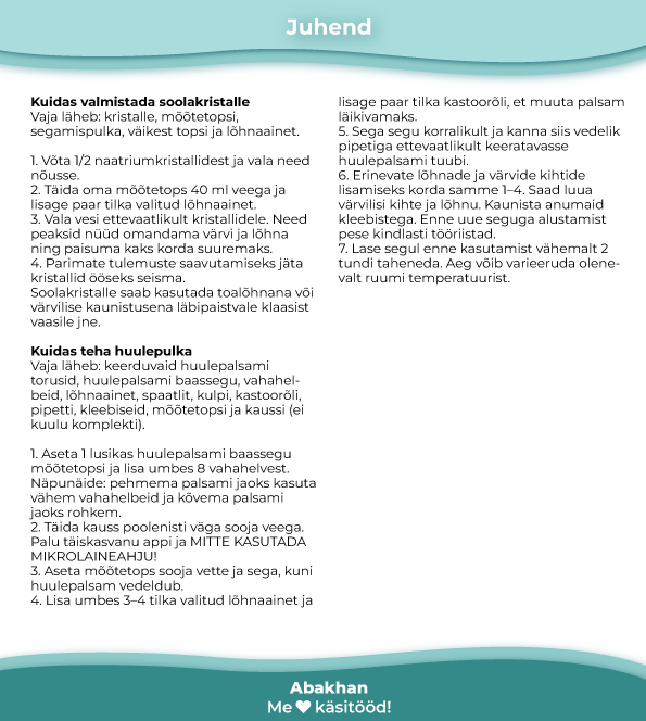 Vaja läheb: huulepalsami konteinerid, huulepalsami baassegu, lõhnaainet, spaatlit, kulbi, kleebiseid, mõõtetopsi ja kaussi (ei kuulu komplekti).