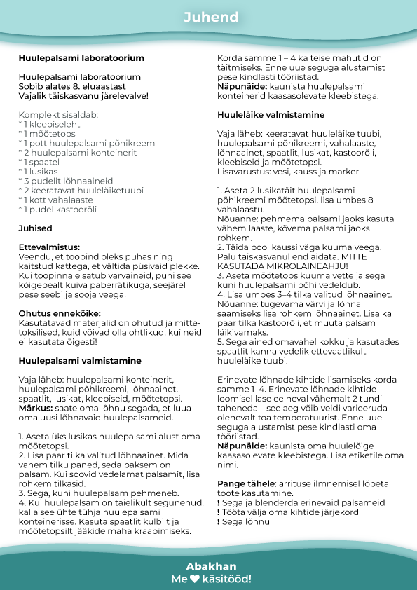 Vaja läheb: keeratavat huuleläike tuubi, huulepalsami põhikreemi, vahalaaste, lõhnaainet, spaatlit, lusikat, kastoorõli, kleebiseid ja mõõtetopsi.