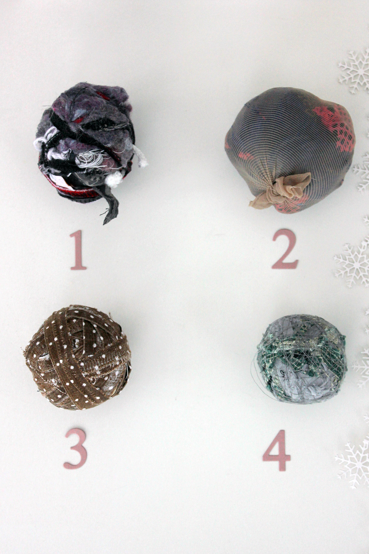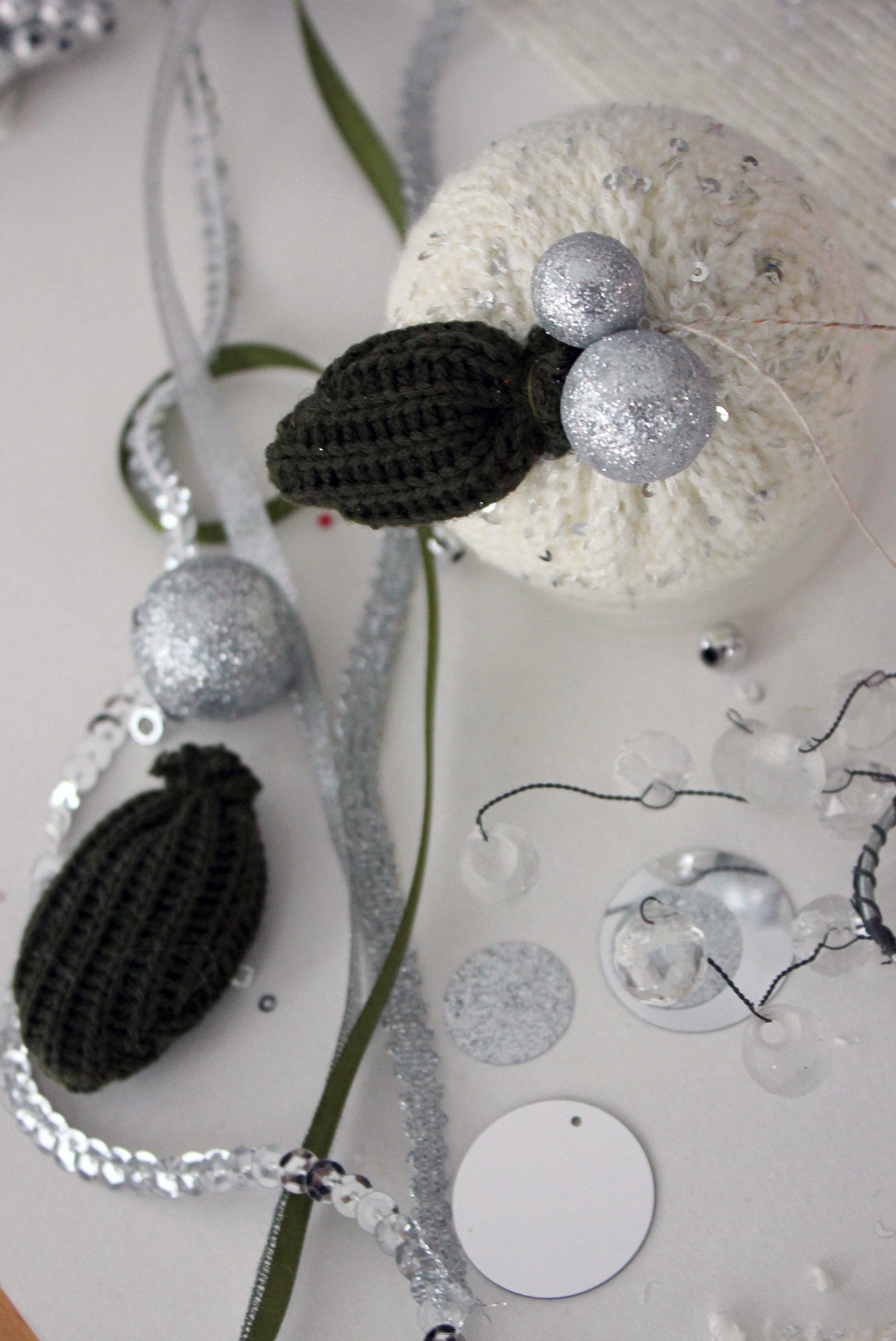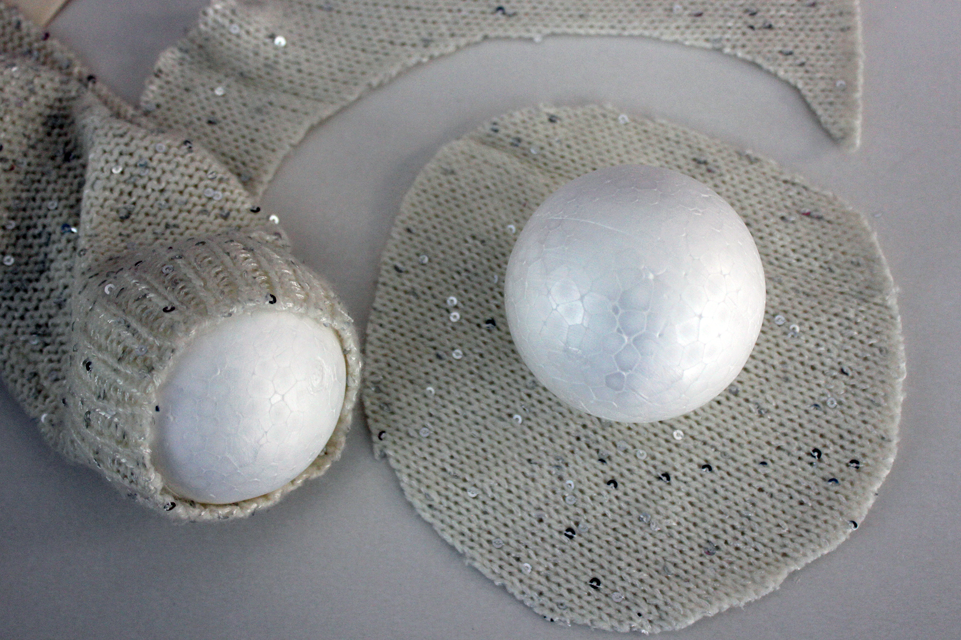 5. Если лицевая и изнаночная стороны материалов отличаются, как, например, в случае со свитером с пайетками, воспользуйтесь этим при покрытии шара. Таким образом, из одной вещи можно получить несколько разных материалов, что дает возможность создавать оригинальные украшения.