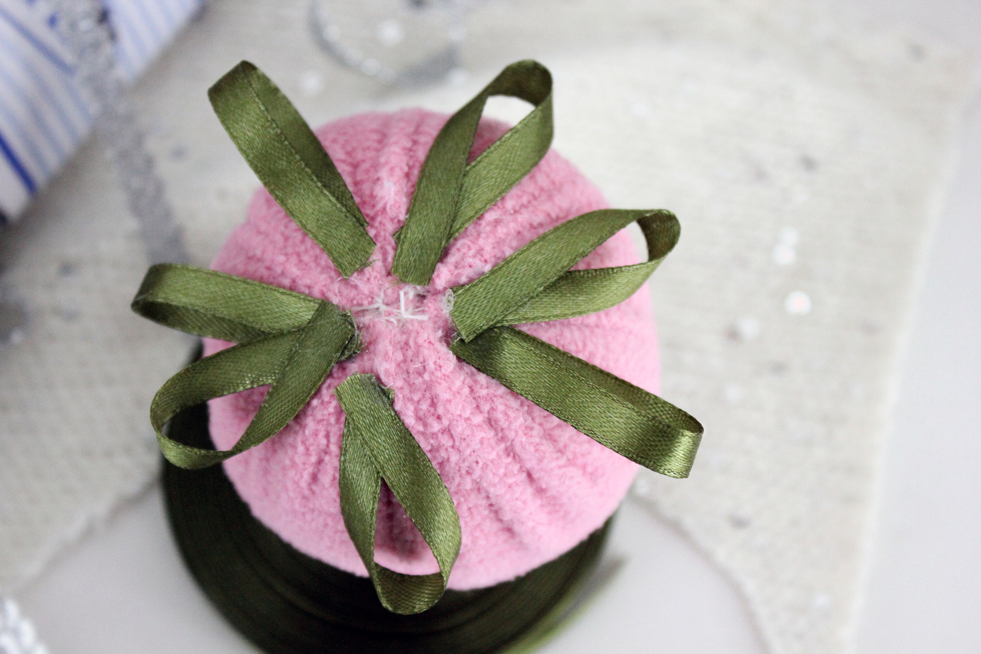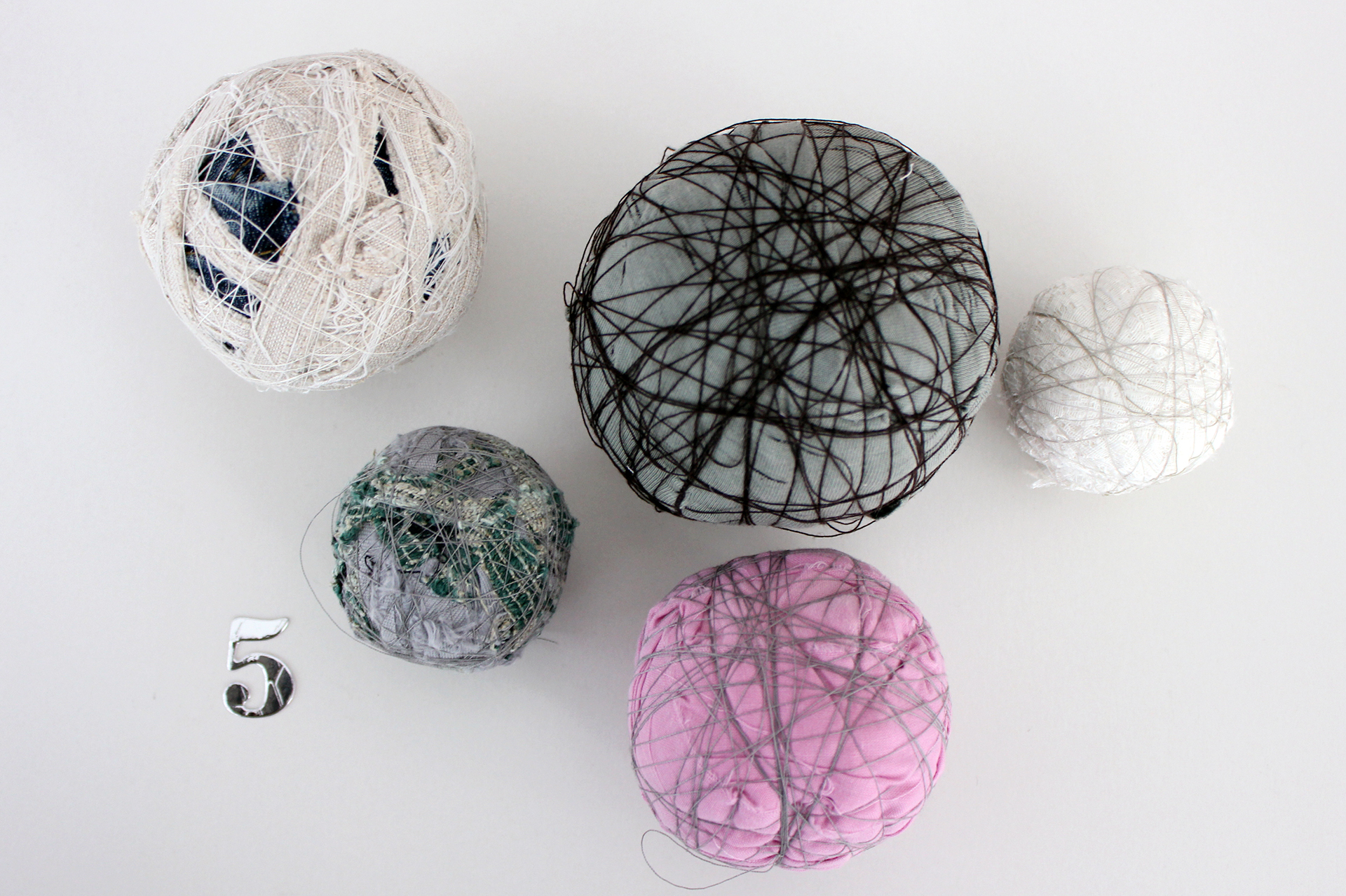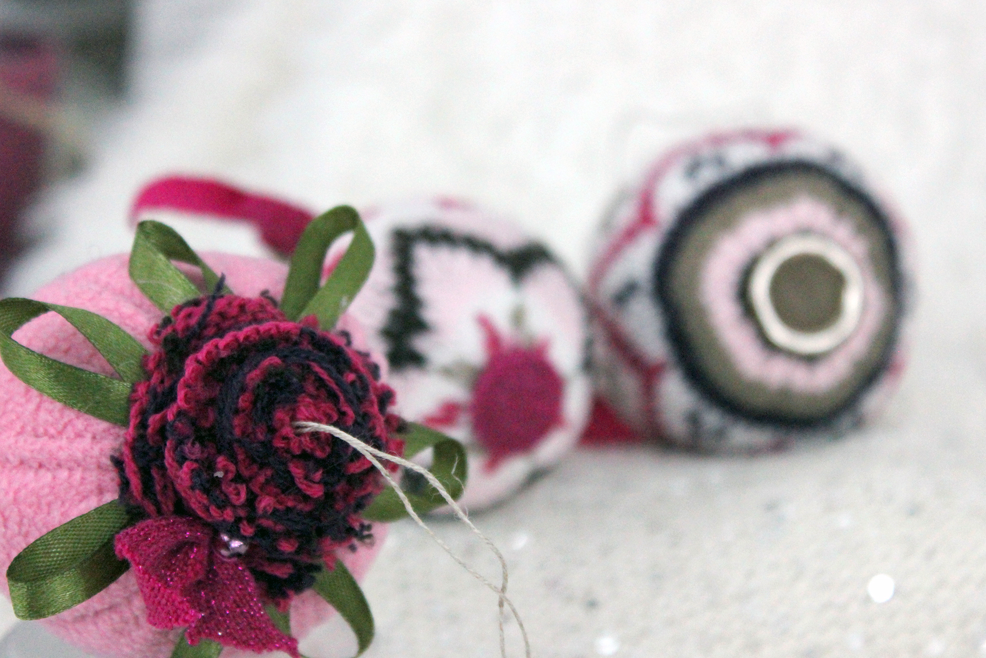 5. Если лицевая и изнаночная стороны материалов отличаются, как, например, в случае со свитером с пайетками, воспользуйтесь этим при покрытии шара. Таким образом, из одной вещи можно получить несколько разных материалов, что дает возможность создавать оригинальные украшения.