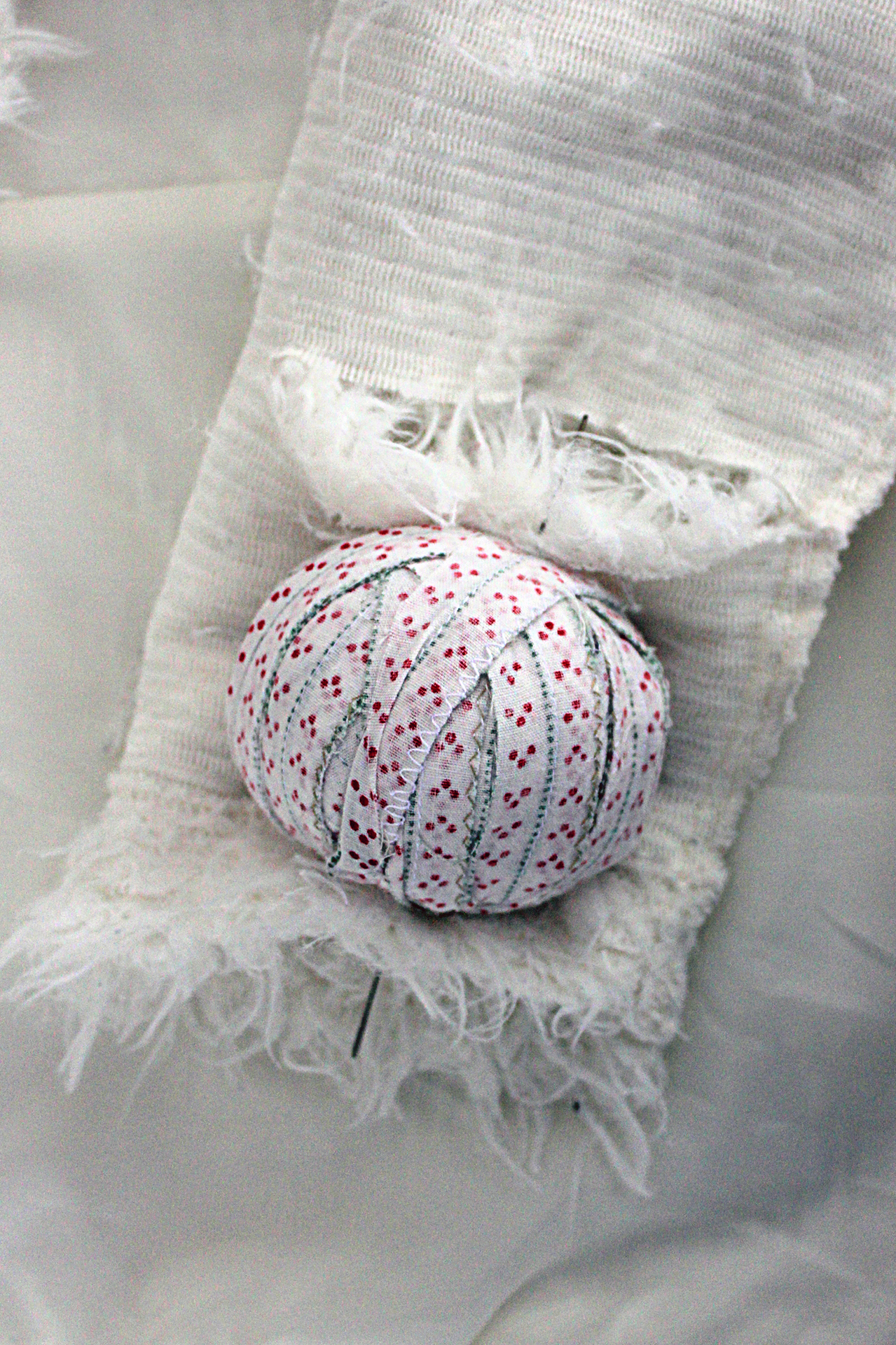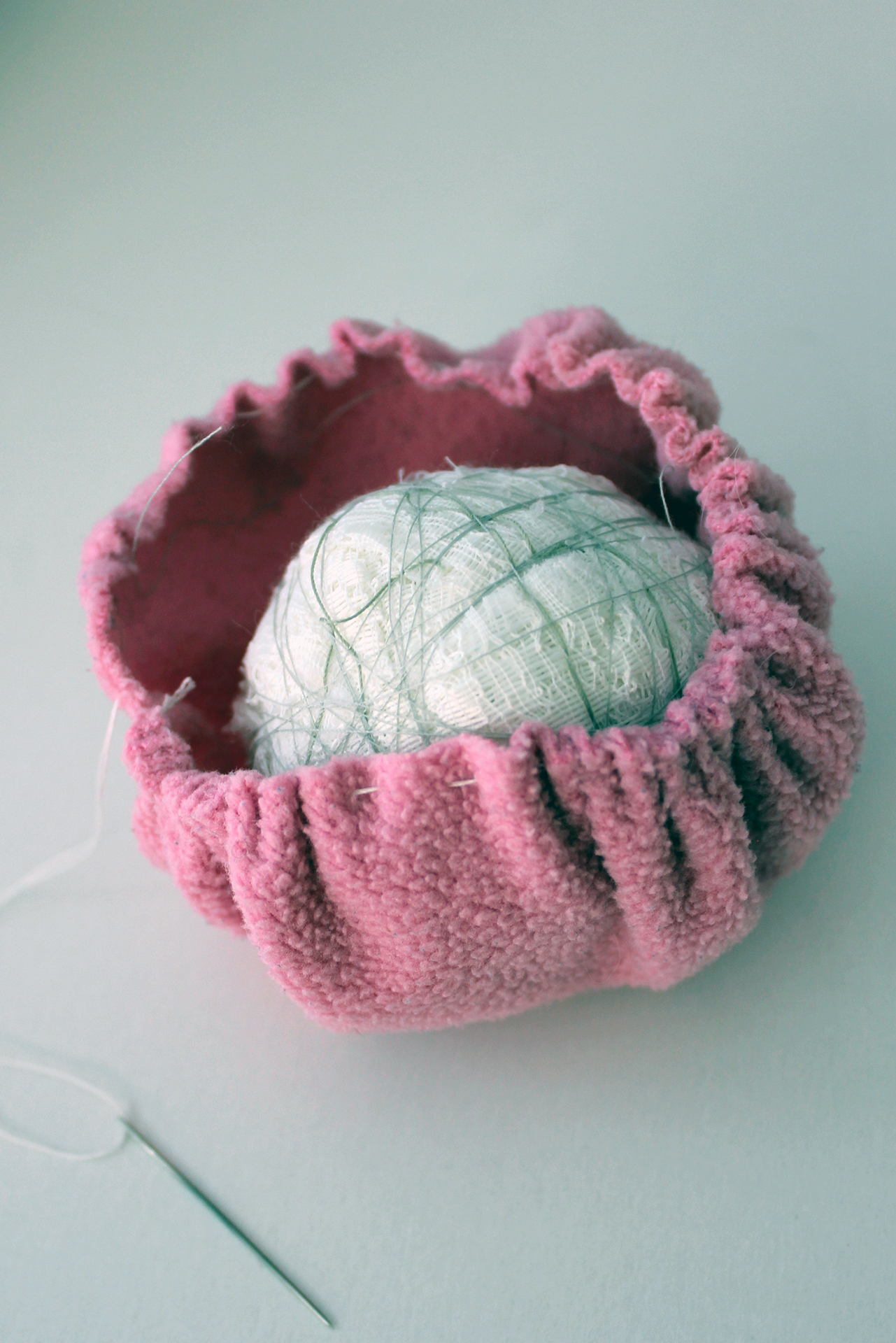 2. Вырежьте из ткани круг нужного размера, наметайте по краю, чтобы можно было собрать ткань, стяните нить, чтобы шарик остался внутри.