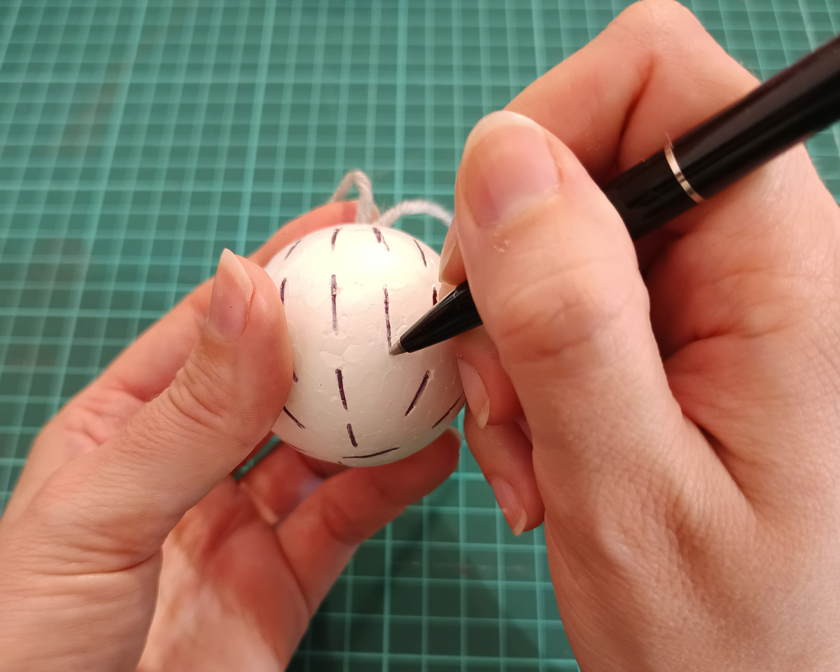 - Темным карандашом или маркером нарисуйте на шаре места надрезов, чтобы работа была проще и точнее.