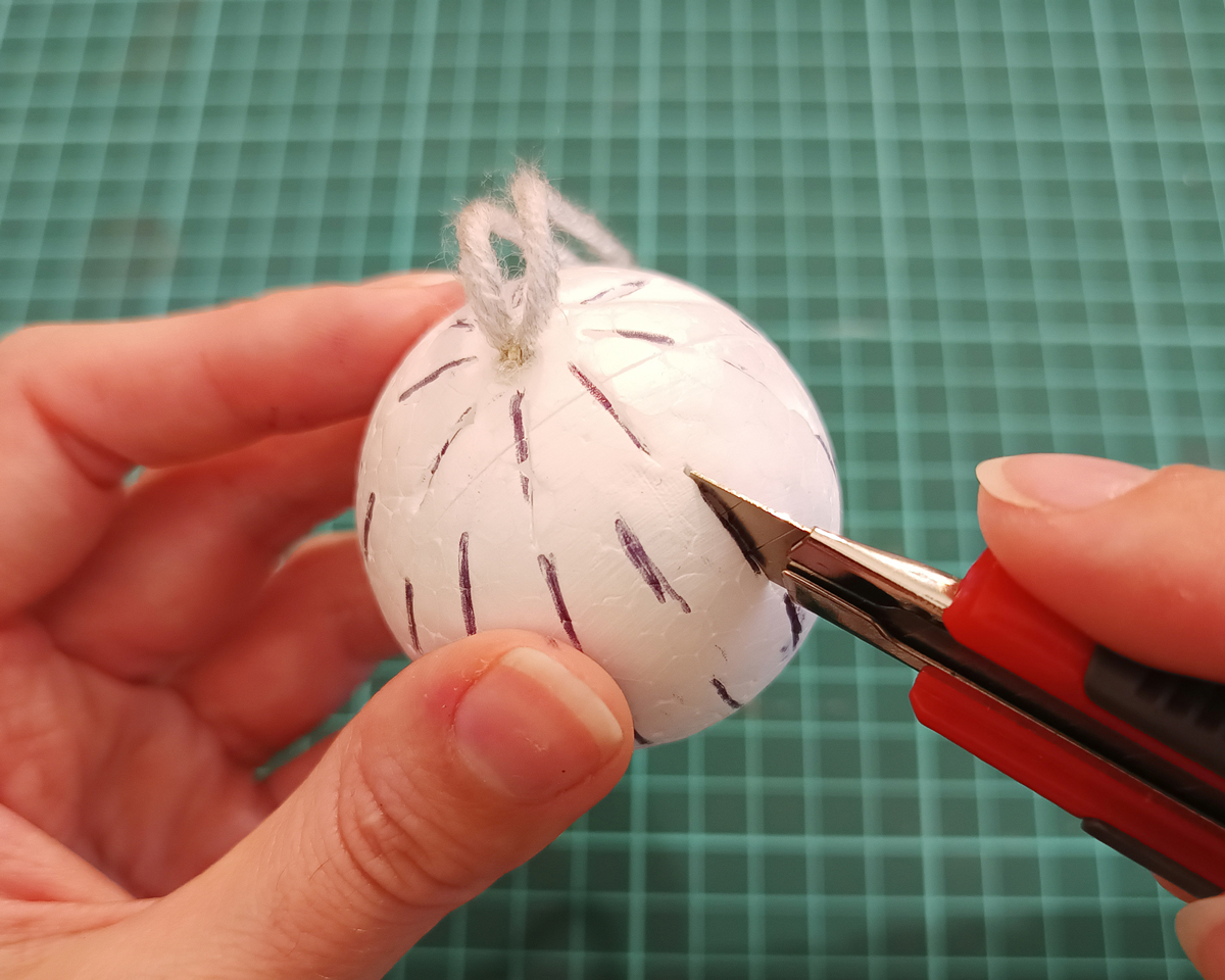 - Аккуратно сделайте надрезы в отмеченных местах. Избегайте слишком частых прорезов, чтобы шар не стал ломким.