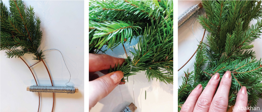 - Начните работу с внешнего круга. Присоедините конец проволоки к кольцу несколькими витками и начните попарно вплетать в каркас еловые ветки. При помощи пары витков проволокой букет из веточек должен крепко держаться. Убедитесь, что веточки достаточной прочно прикреплены. Каждая последующая пара должна перекрывать предыдущую точку крепления. Устанавливайте букеты из веточек друг на друга так плотно, насколько пушистый венок вы хотите получить, и сколько материала вы можете использовать.