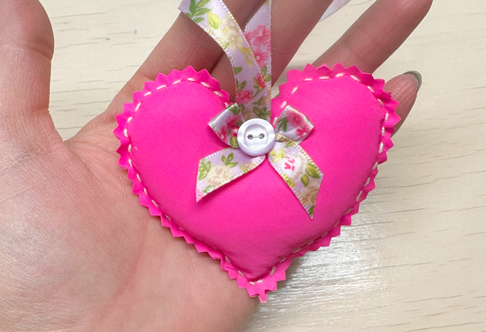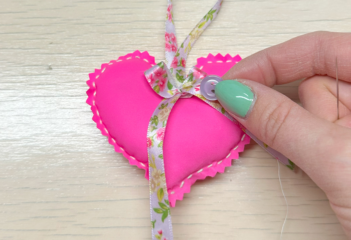 7. Пришейте ленточку и украшения – Сделайте петельку из ленточки и пришейте к верхней части сердечка. Можно также добавить пуговицу или бусину для красоты.